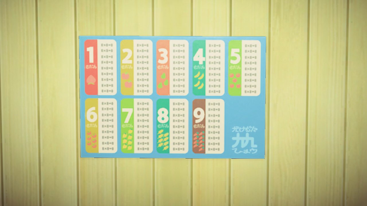 Infine, è interessante notare anche come un oggetto in-game, cioè il poster da studio (Tabelline), riporti su di sé le immagini di alcuni frutti che non sono ancora presenti su New Horizons. Infatti, in questo poster, oltre alla frutta già esistente e alla verdura già annunciata nel Direct, possiamo vedere anche banane e limoni.
