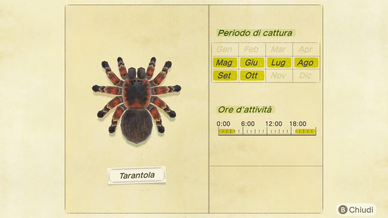 Nel corso dei mesi in cui sarà possibile catturare sulla propria isola (sempre secondo l'emisfero scelto) un esemplare di tarantola, lo spawn, ovvero il tasso di apparizione dello stesso, sarà del 2%.