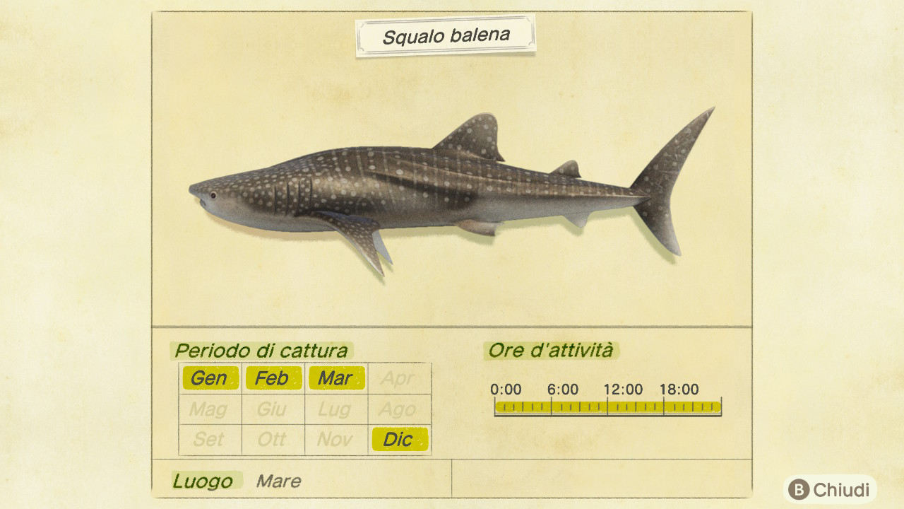 Nel corso dei mesi in cui sarà possibile catturare sulla propria isola (sempre secondo l'emisfero scelto) un esemplare di Squalo balenasqualo balena, lo spawn, ovvero il tasso di apparizione dello stesso, sarà dell'1%.