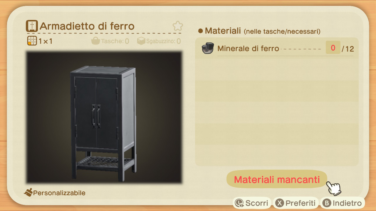 Per ottenere un'unità di armadietto di ferro (Nero) sarà prima di tutto necessario possedere lo schema fai da te all'interno dell'app Laboratorio del proprio Nook Phone.