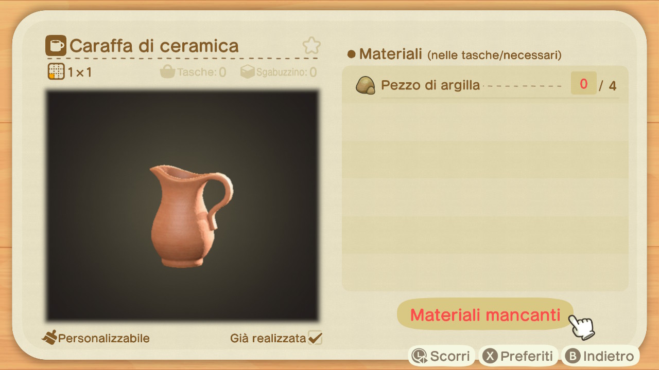 Per ottenere un'unità di caraffa di ceramica (Non smaltato) sarà prima di tutto necessario possedere lo schema fai da te all'interno dell'app Laboratorio del proprio Nook Phone.