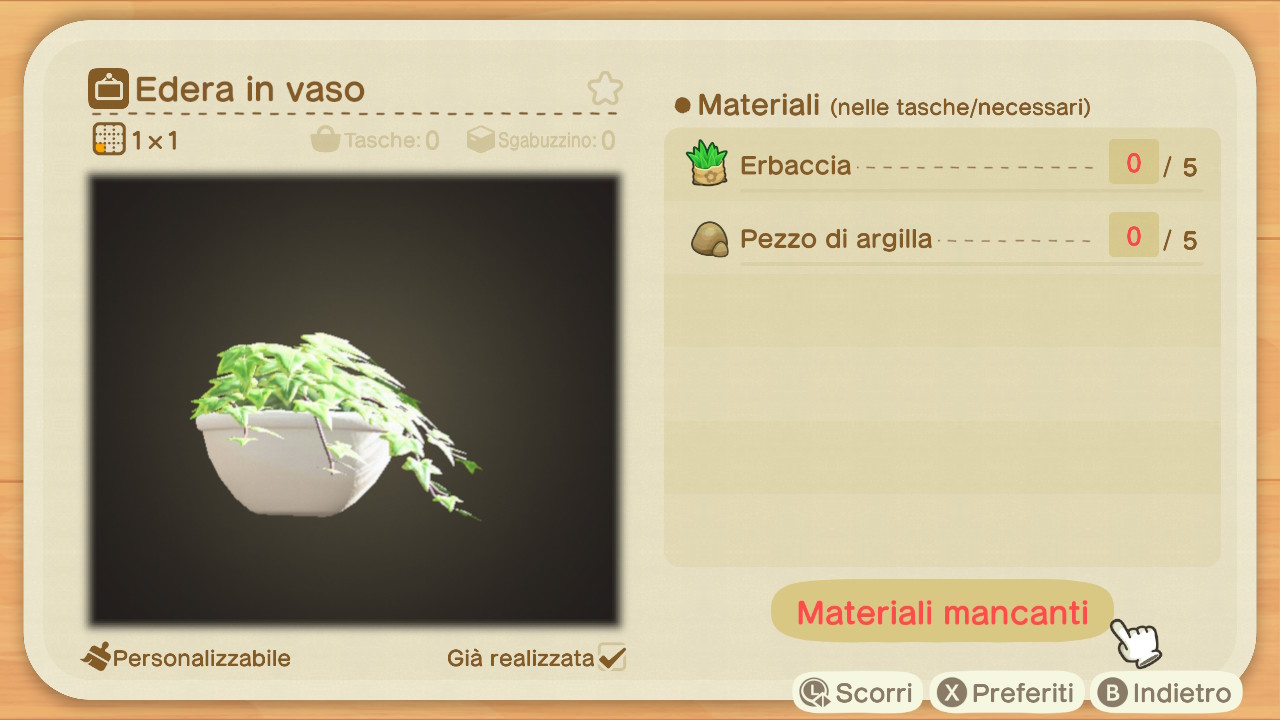 Per ottenere un'unità di edera in vaso (Verde chiaro) sarà prima di tutto necessario possedere lo schema fai da te all'interno dell'app Laboratorio del proprio Nook Phone.