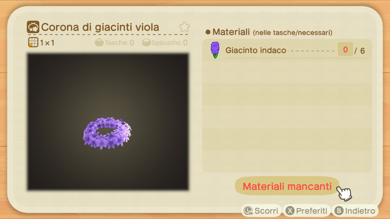 Per ottenere un'unità di corona di giacinti viola (Nessuna variazione) sarà prima di tutto necessario possedere lo schema fai da te all'interno dell'app Laboratorio del proprio Nook Phone.