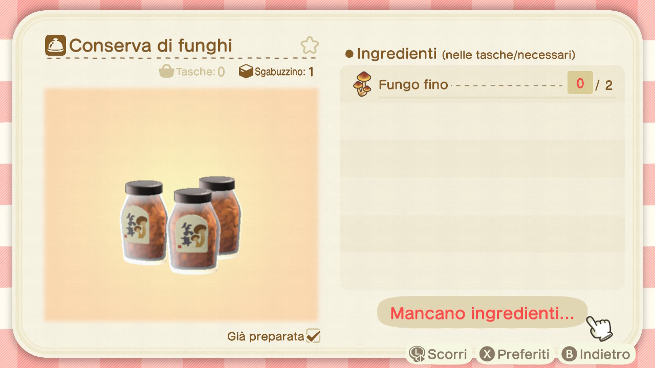 Per ottenere un'unità di Conserva di funghiconserva di funghi sarà prima di tutto necessario possedere lo schema fai da te all'interno dell'app Laboratorio del proprio Nook Phone.