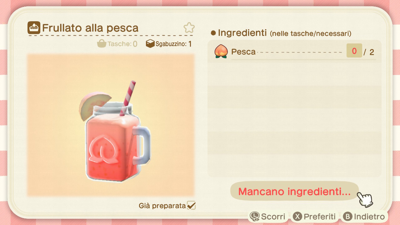 Per ottenere un'unità di Frullato alla pescafrullato alla pesca sarà prima di tutto necessario possedere lo schema fai da te all'interno dell'app Laboratorio del proprio Nook Phone.