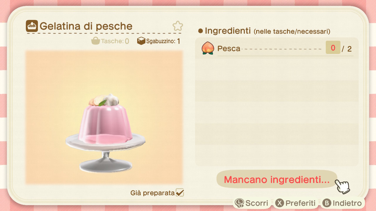 Per ottenere un'unità di Gelatina di peschegelatina di pesche sarà prima di tutto necessario possedere lo schema fai da te all'interno dell'app Laboratorio del proprio Nook Phone.