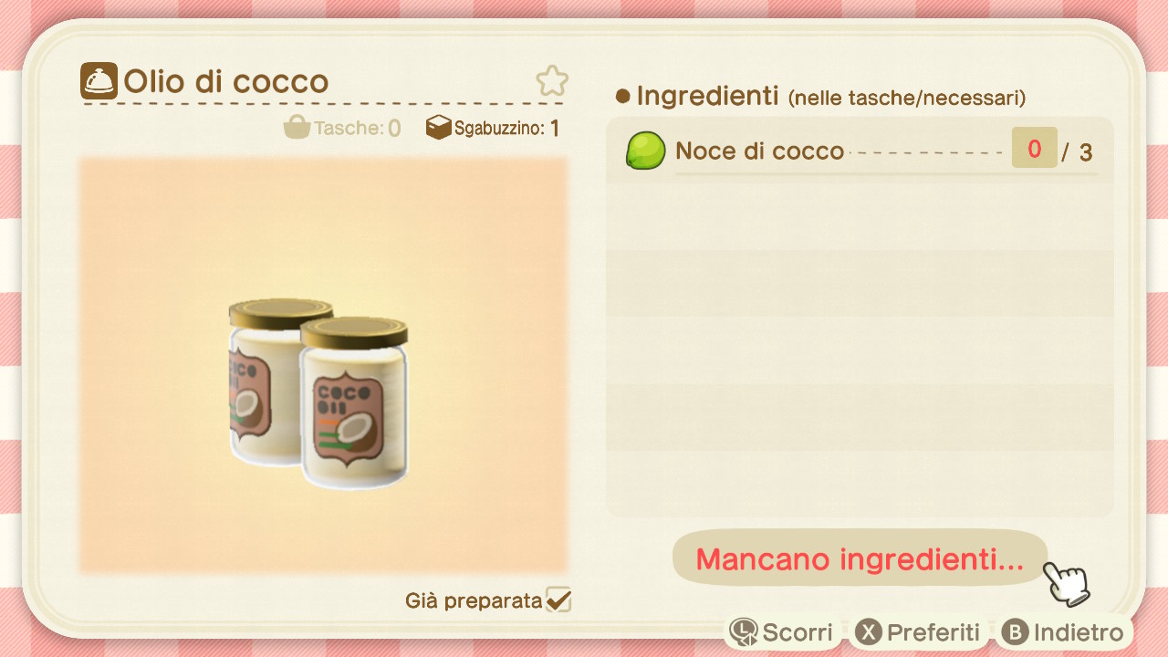 Per ottenere un'unità di olio di cocco sarà prima di tutto necessario possedere lo schema fai da te all'interno dell'app Laboratorio del proprio Nook Phone.
