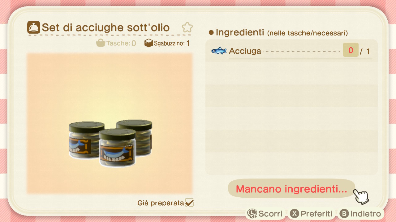 Per ottenere un'unità di set di acciughe sott’olio sarà prima di tutto necessario possedere lo schema fai da te all'interno dell'app Laboratorio del proprio Nook Phone.
